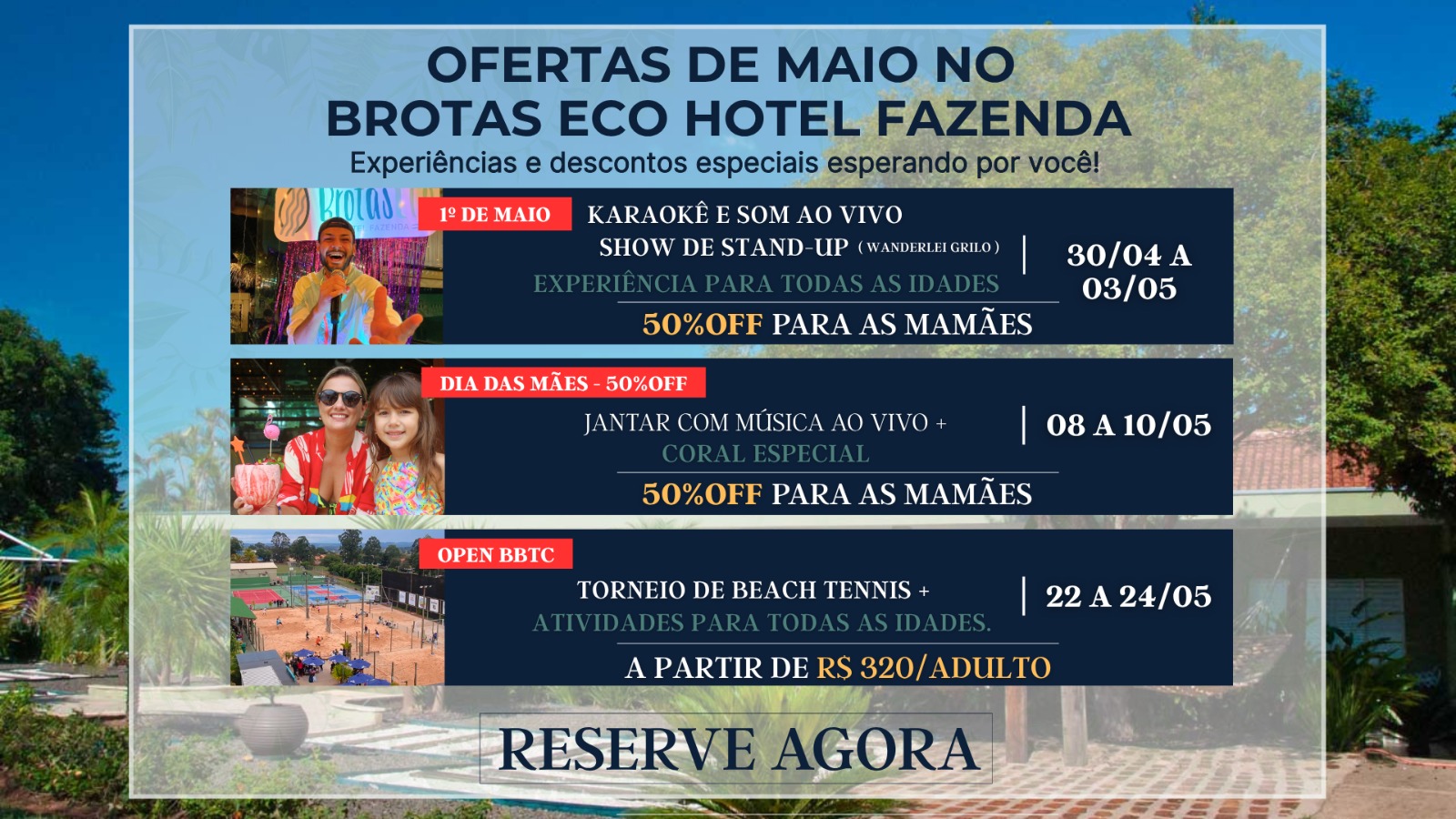 Priscilla De MelloFérias Família Julho Eco Brotas Resort Pelo 2° ano consecutivo Brotas foi mais uma vez nosso destino de férias de Julho. E o Brotas Eco Resort foi novamente nosso hotel escolhido. Infraestrutura completa, 3 refeições diárias com buffet completo, diversificado e a cereja do bolo, como sempre são os recreadores nota 10 do Eco Brotas. Simpatia, Alegria, conseguem entreter todas as idades e alguns deles acabam tornando-se amigos pra vida. Super recomendo, meus filhos de 14 e 9 anos aproveitam muito e sempre querem retornar! Até breve equipe Eco Brotas!